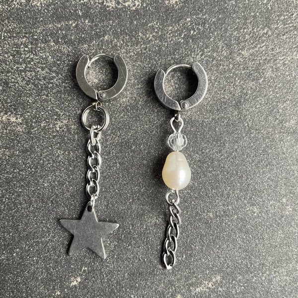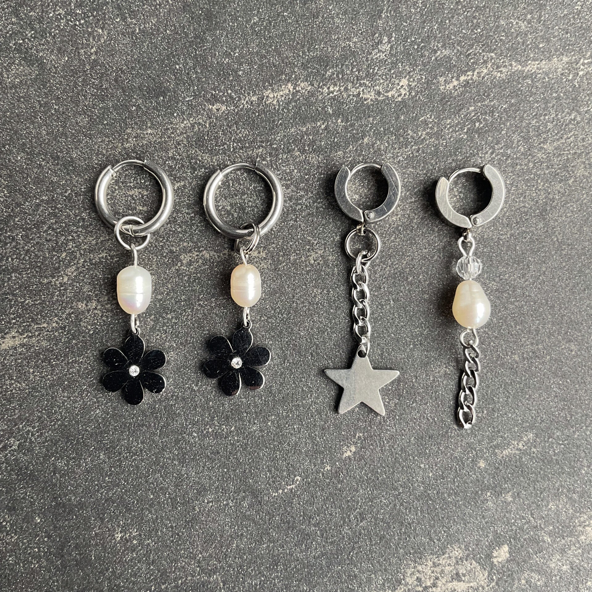 They are made with 100% stainless steel. And they ave some freshwater pearls and one a glass bead.