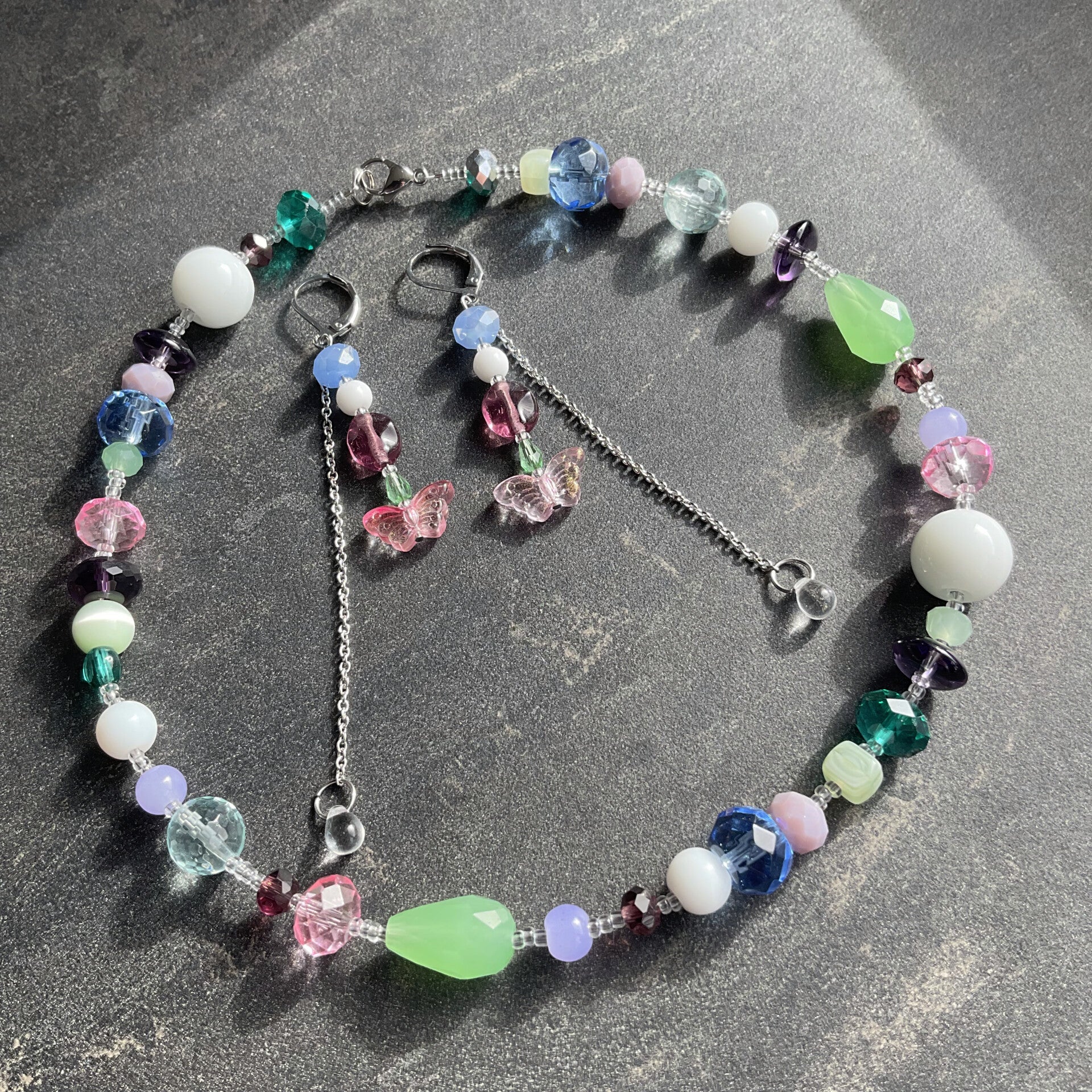 It is made with stainless steel. The beads used are glass beads, seed beads and freshwater pearls.