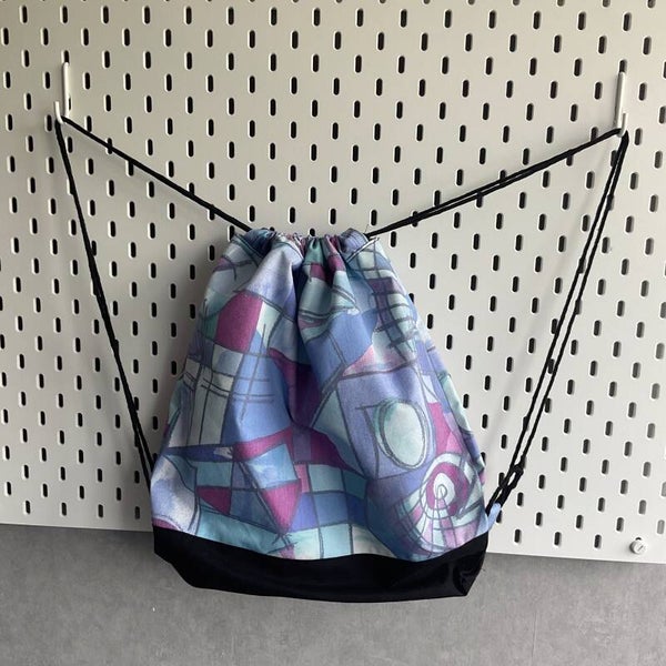 Cute drawstring bag with an interesting fabric print! It can be used for many different things!