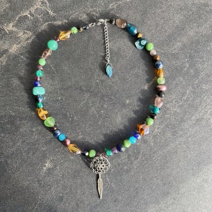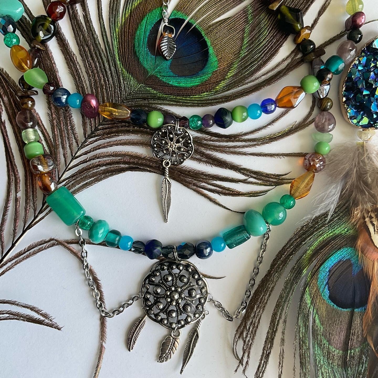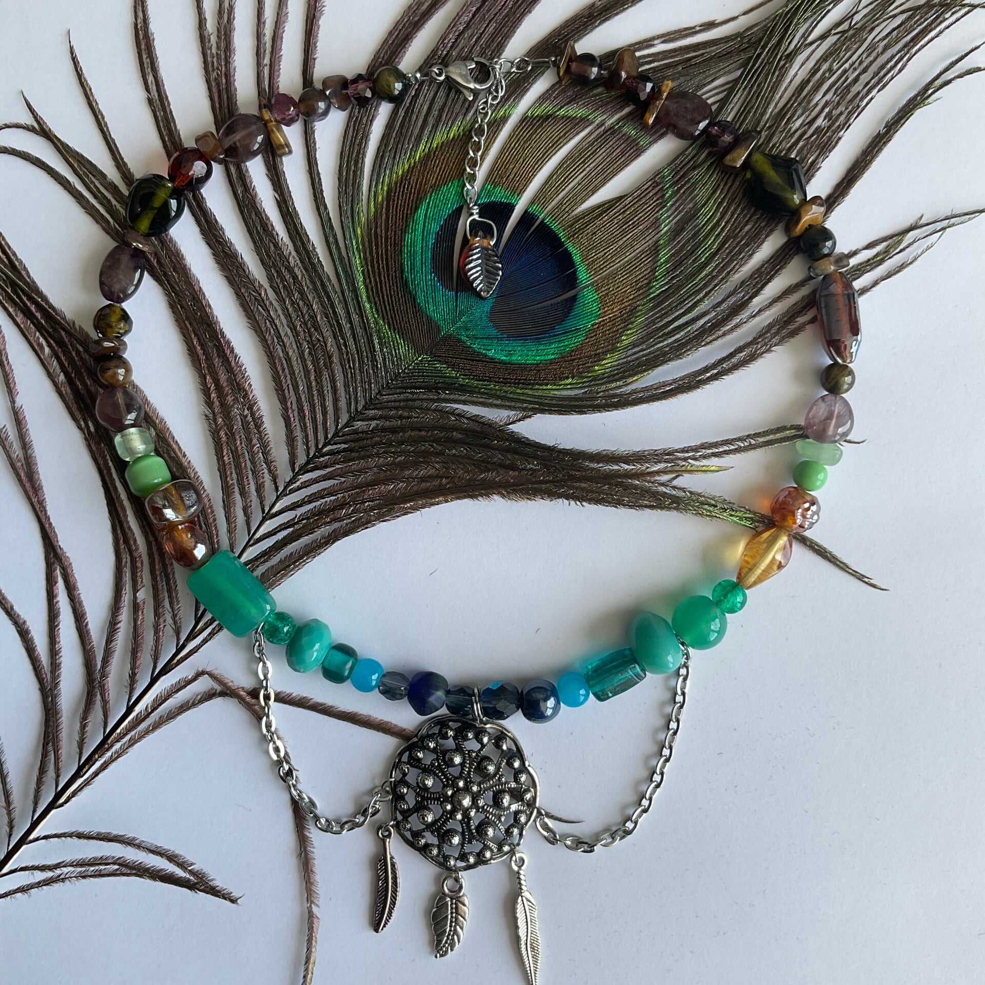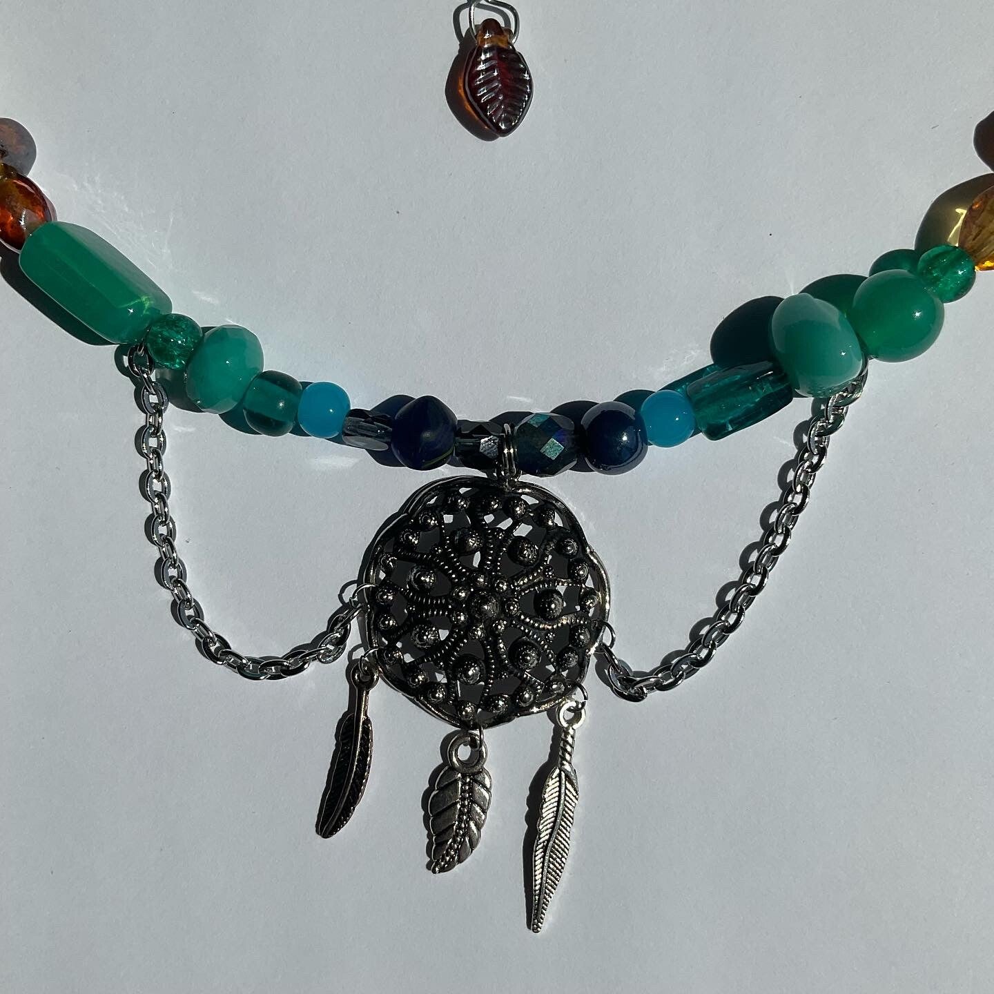 Made with galss beads, tiger eye beads. The large middle charm is thrifted and the feathers attached are metal charms.