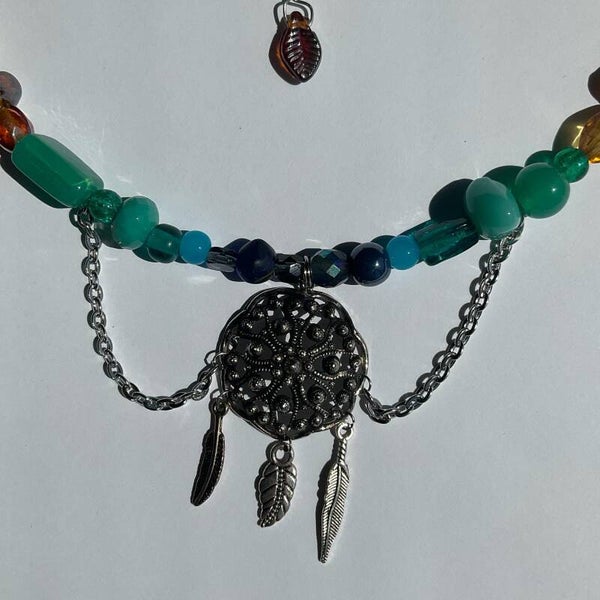Made with galss beads, tiger eye beads. The middle charm is thrifted and the feathes attached is a metal charm. The little leaf is attached to the extension with metal wire.