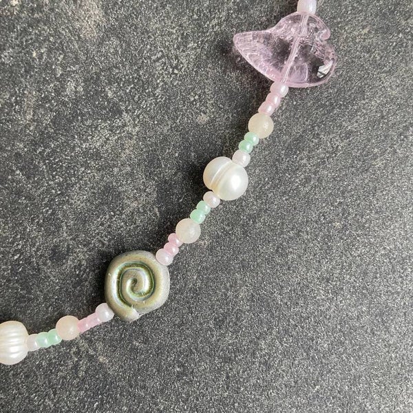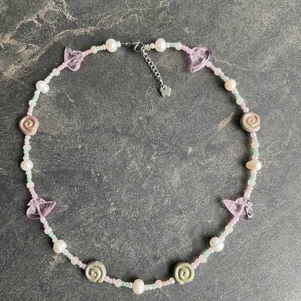 Made with glass beads, freshwater pearls and seed beads.The closure is made with stainless steel.