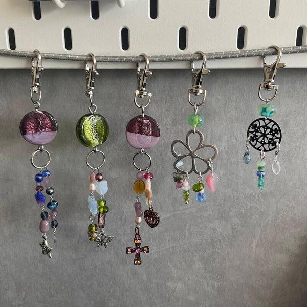 It is made with metal charm, stainless steel charm, metal wire, metal parts and glass beads.