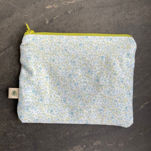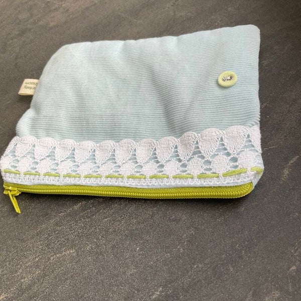 A cute soft baby coloured pouch. With different fabrics on both sides.