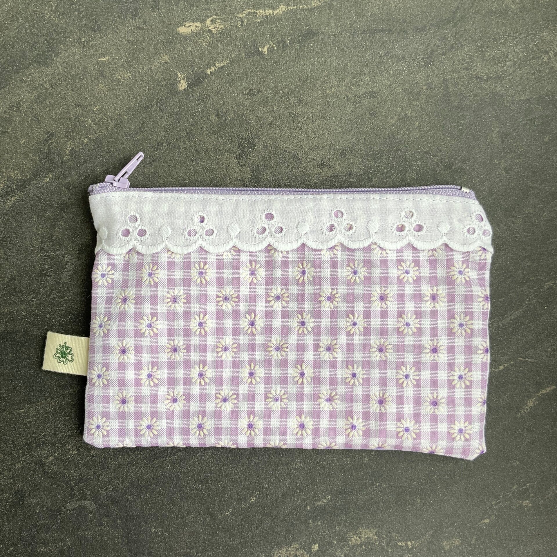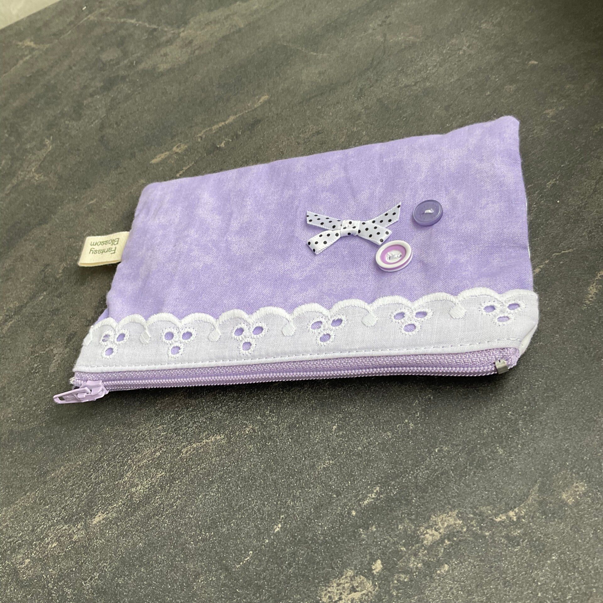 A cute purple zipper pouch. With different fabrics on both sides. With cute details such as lace and buttons/a bow.