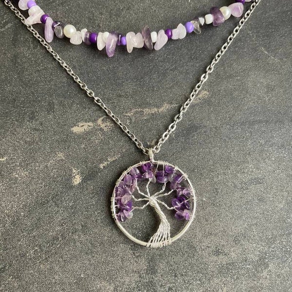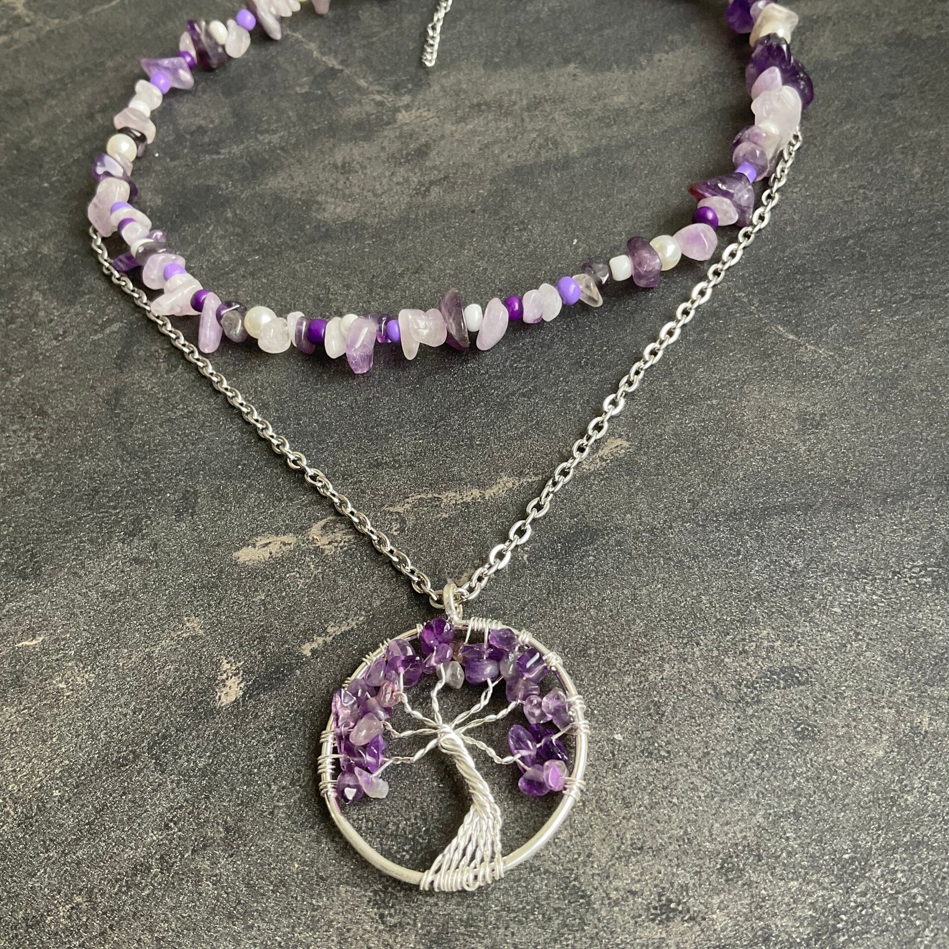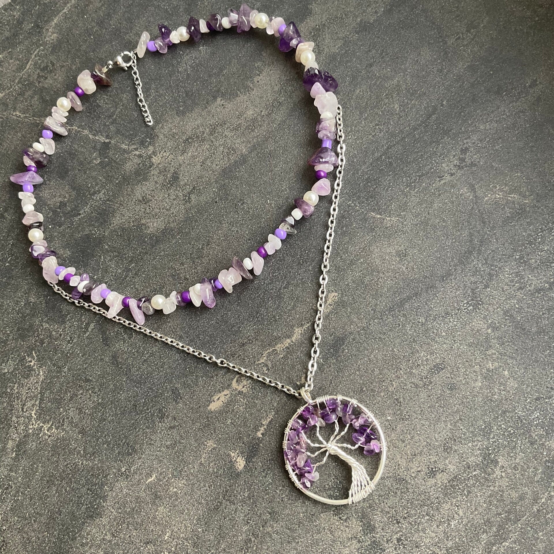 Beads used are amethyst chips, seedbeads, plastic pearls.