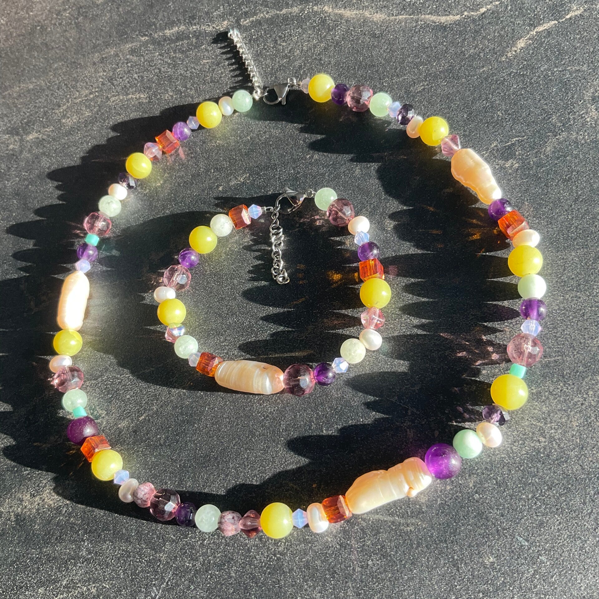 A very dreamy necklace with natural gemstones and freshwater pearls. I bought most of these beads on a very special vacation!