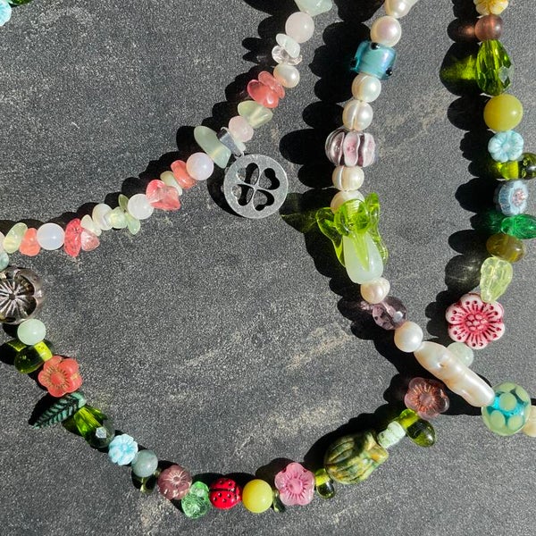 It is made with glass beads and some gemstone beads.Closure is made from stainless steel.
