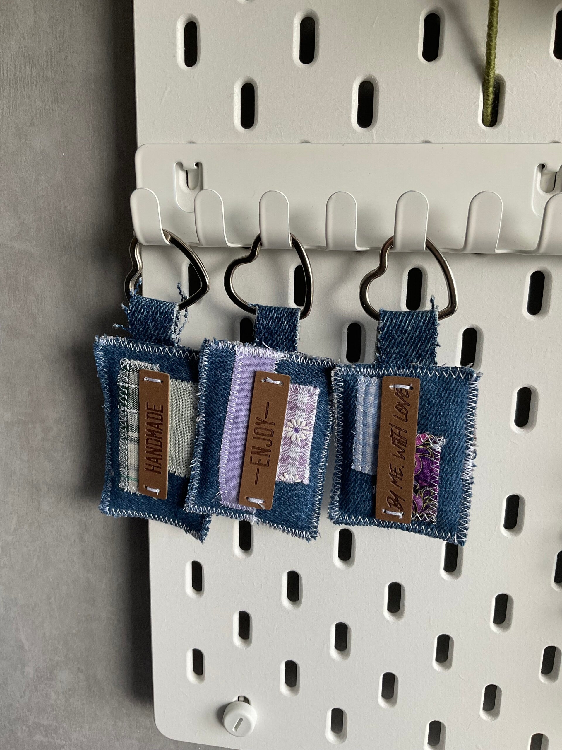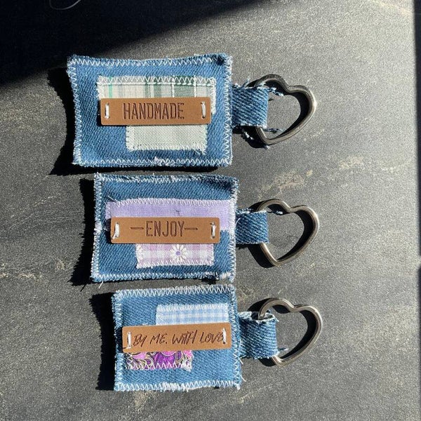 The base is made of denim, with on top scrap fabric and fake leather label. The keyring is metal.